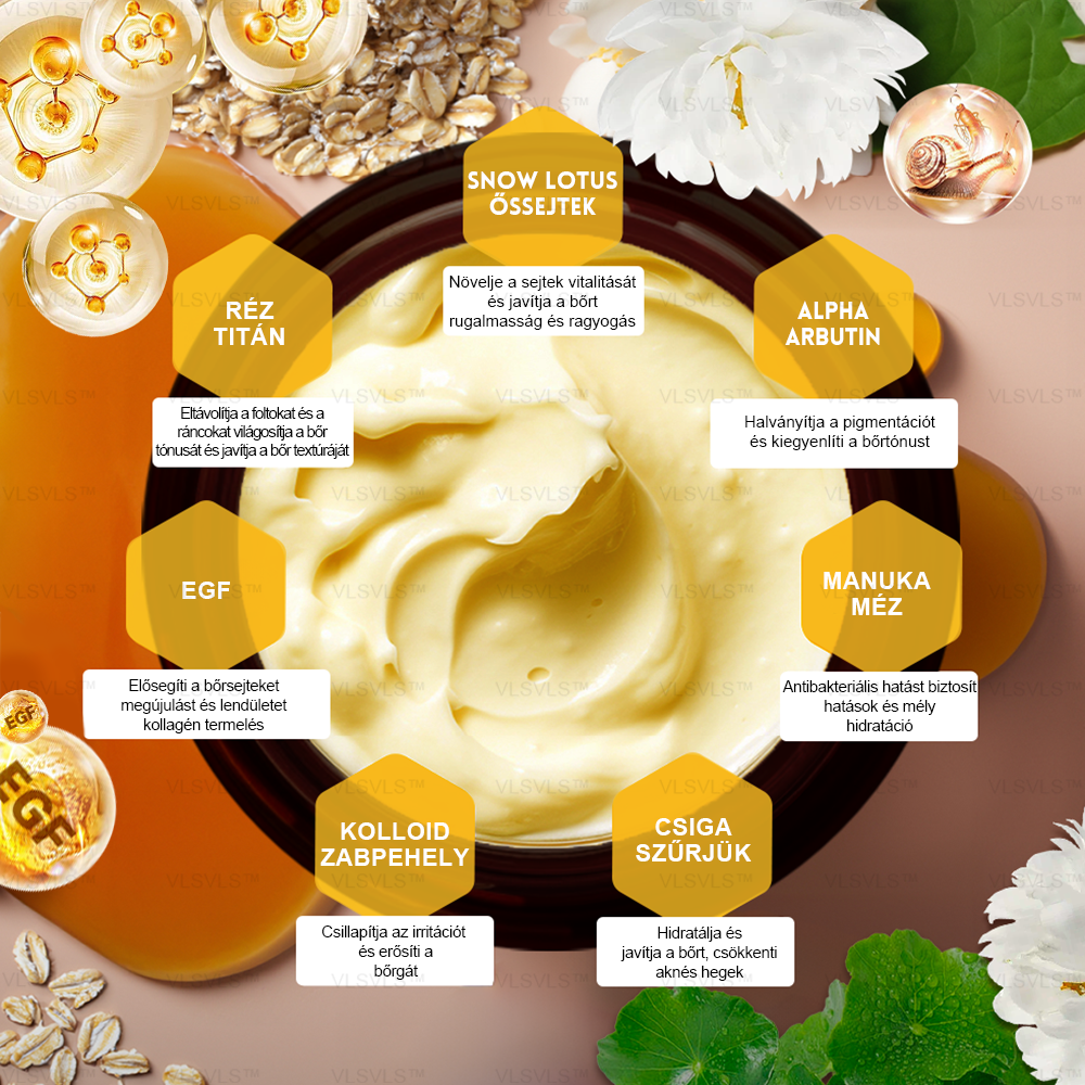 Ez az erőteljes bőrápoló termék a csigaszűrletet, a kolloid zabpelyhet és a Manuka mézet ötvözi, hogy hatékonyan kiküszöbölje a makacs bőrproblémákat. A csigaszűrlet, egy természetes csoda, mélyen behatol, aktiválja a sejtregenerációt és gyorsan helyreállítja a sérült szöveteket, megszünteti az ekcémát, a bőrpírt és a pattanásokat a ragyogó bőrért.